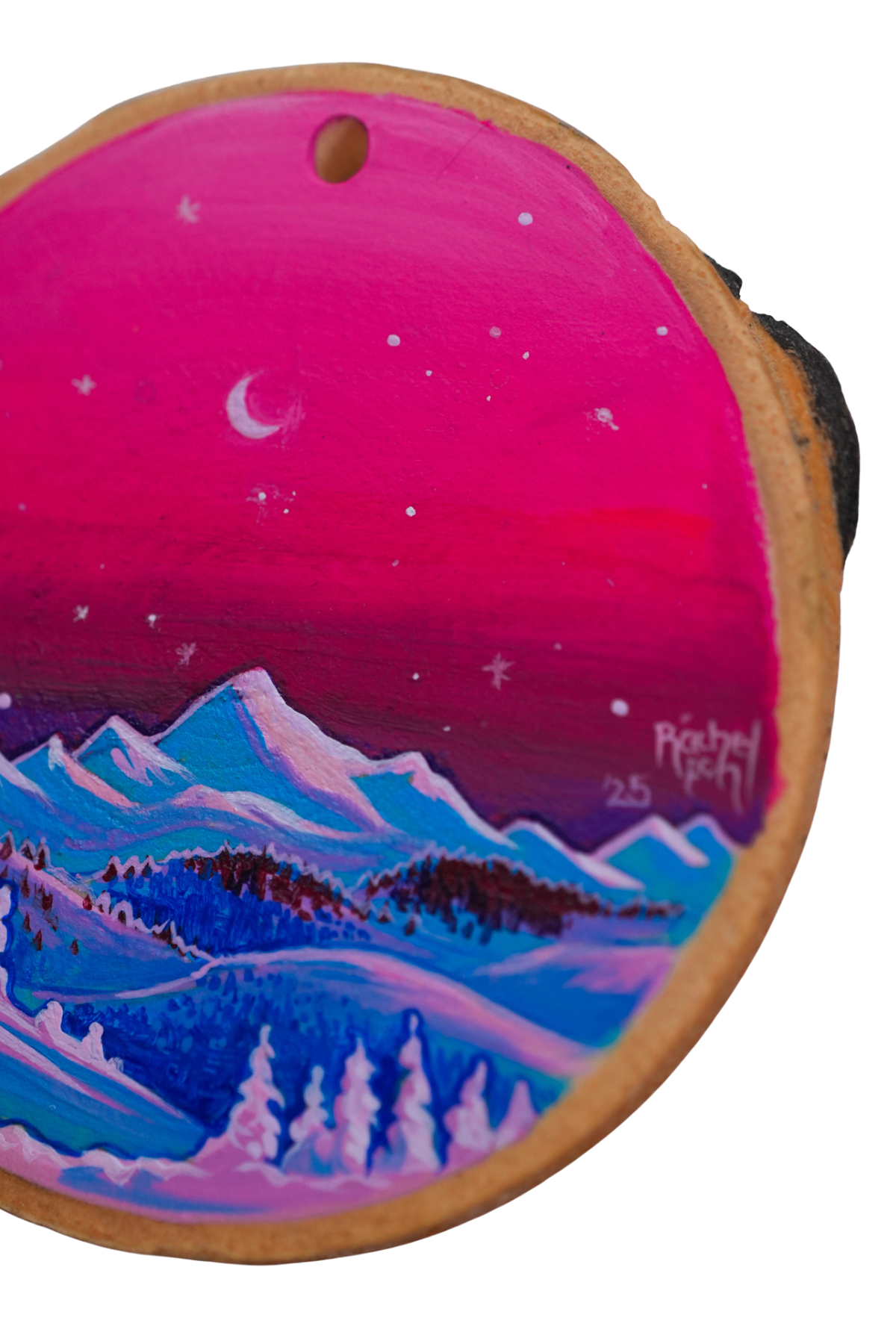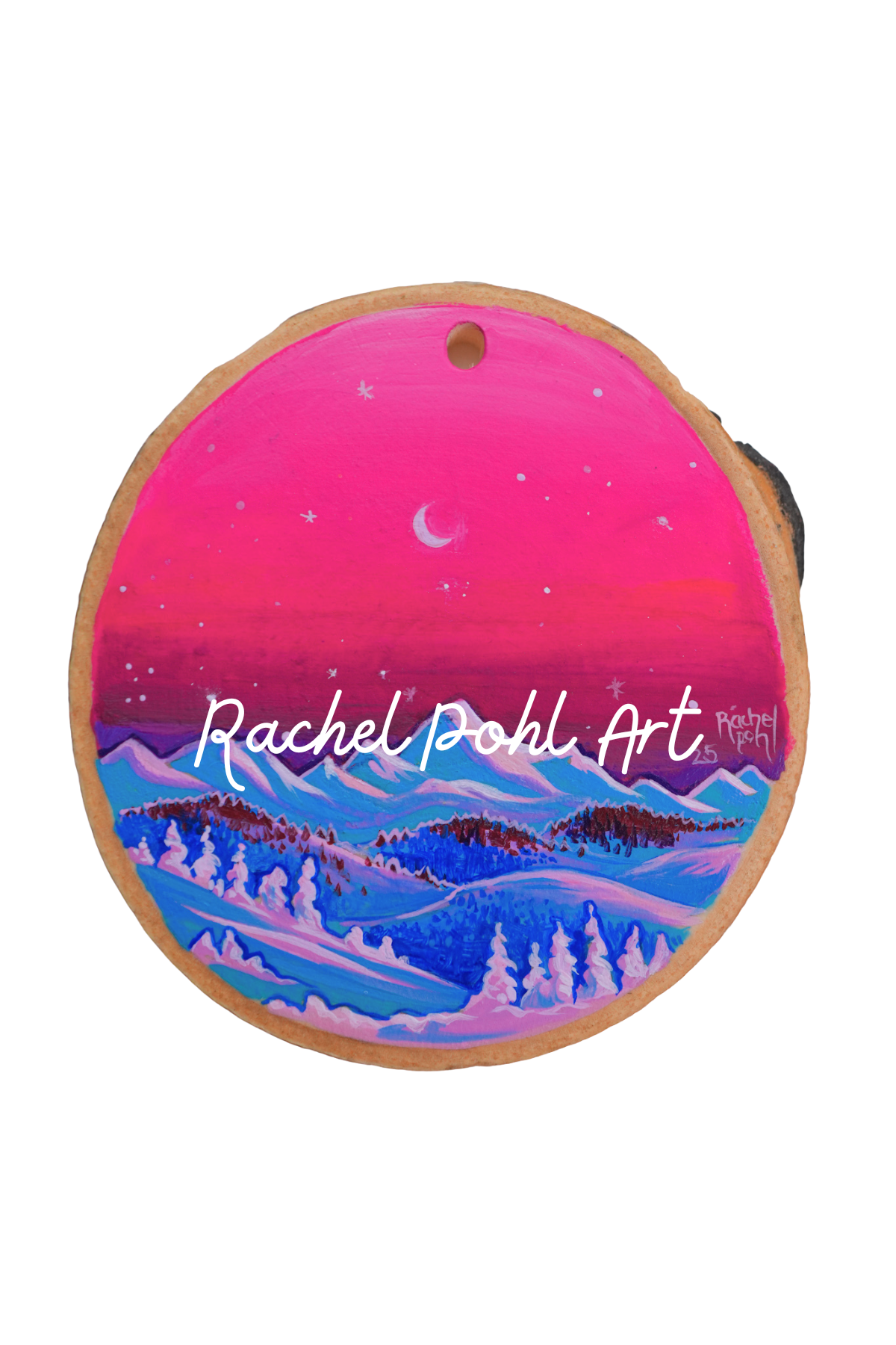 This beautiful little original can be displayed in your home all year round, not just on the tree. The birch wood round was cut to be 1/8” thick, sanded, coated with matte medium, then painted meticulously with acrylic paint. This one of a kind, hand-made, beautiful ornament can be passed on and enjoyed for generations and will bring colorful winter magic to your home!