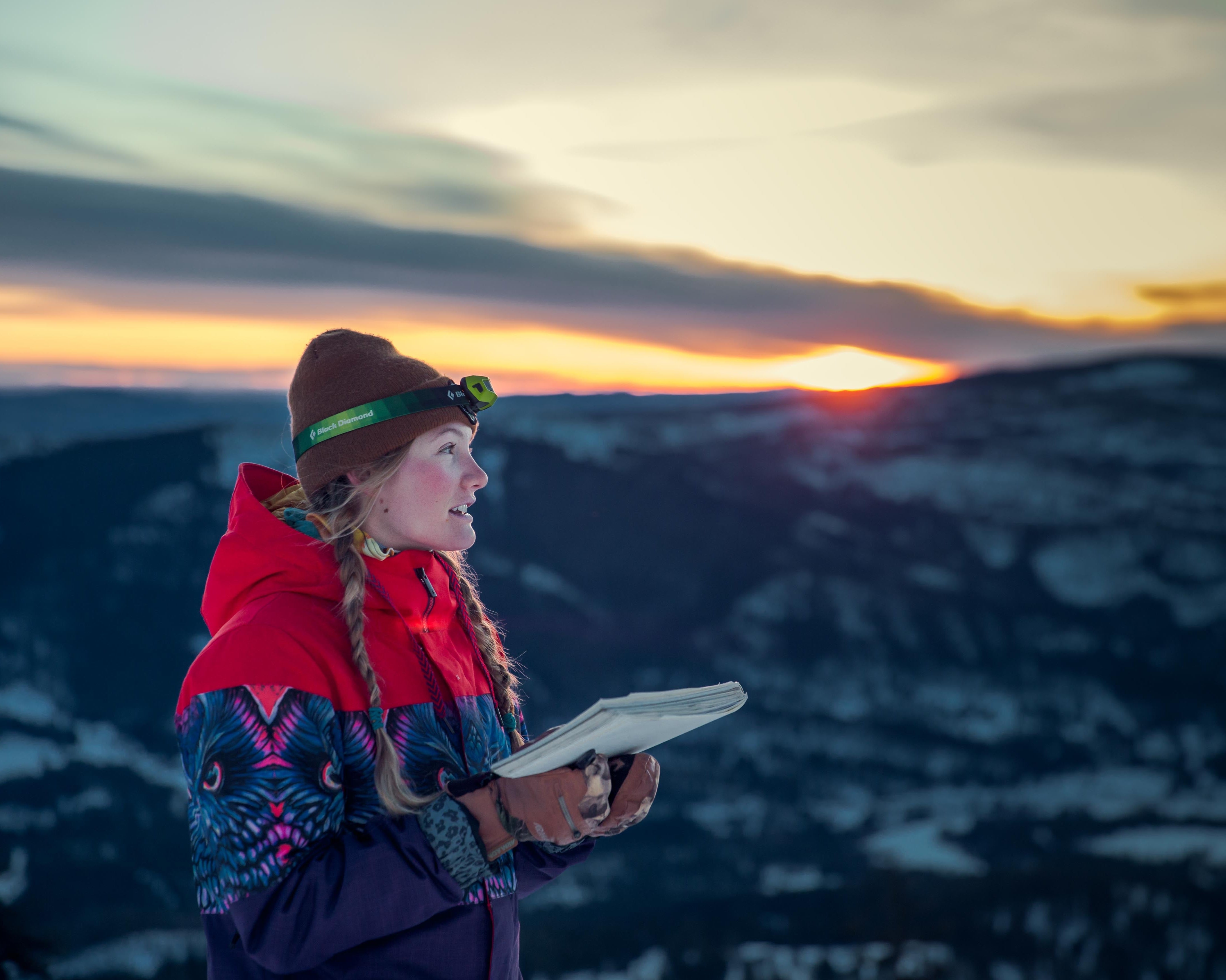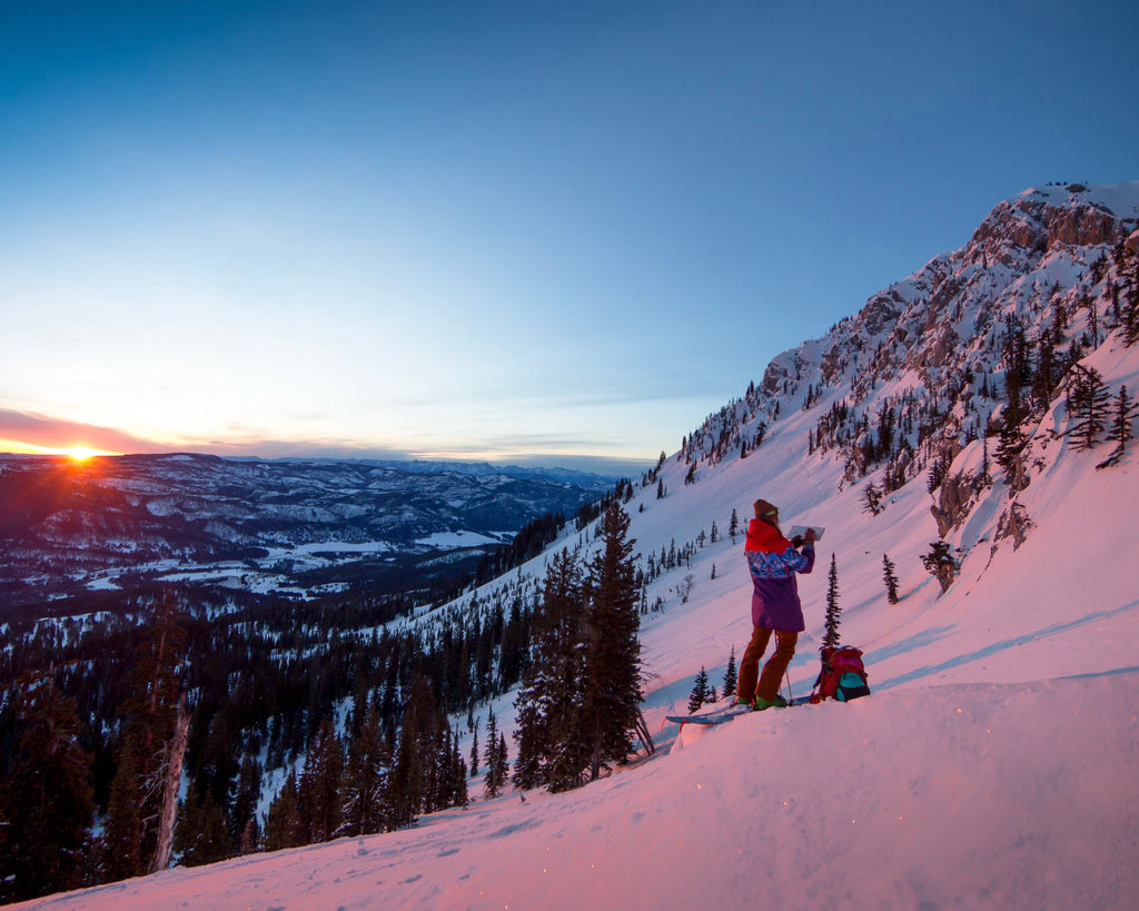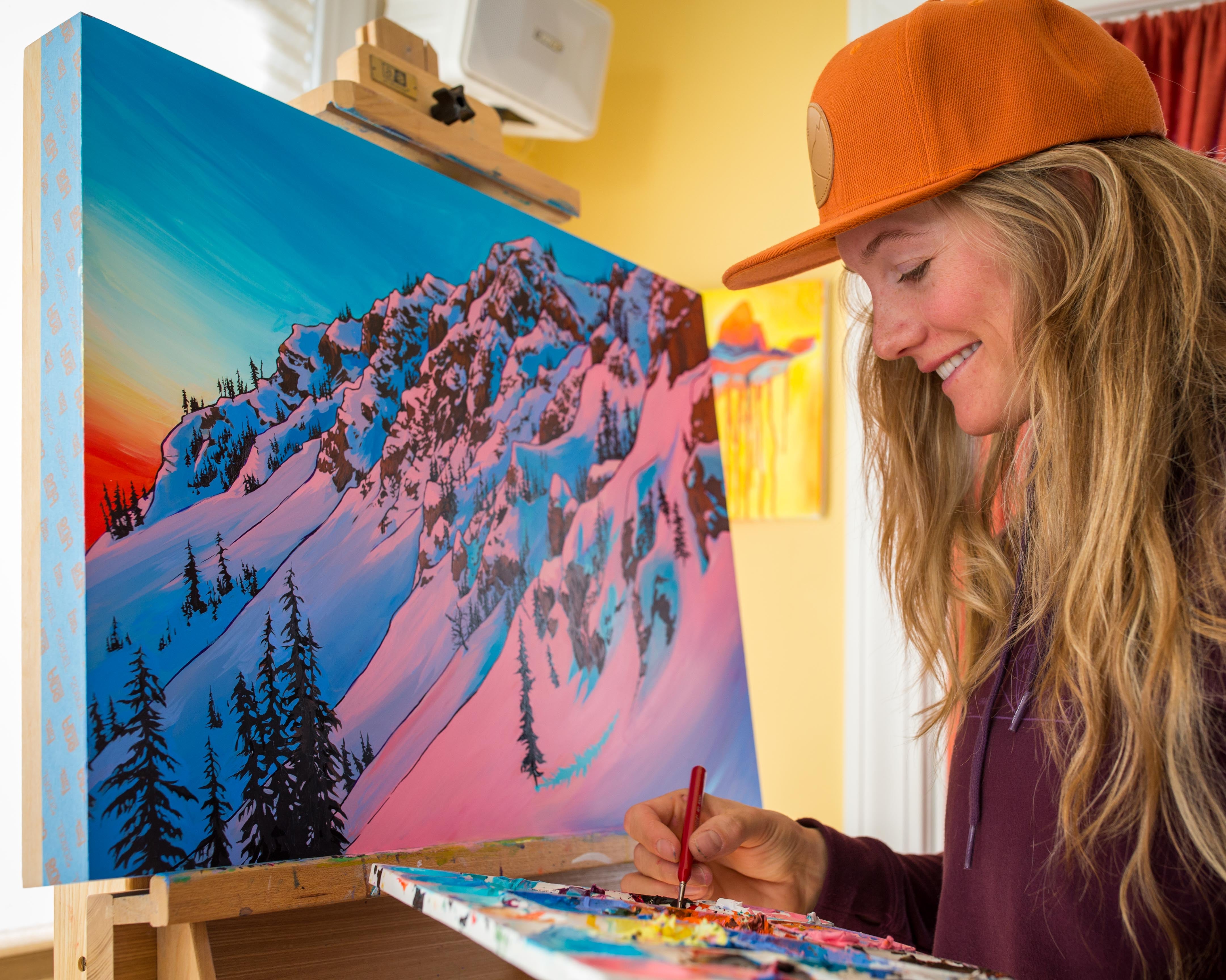 This painting was inspired by a sunrise ski tour in Montana! If you love alpenglow, powder skiing, and the Bridger mountains, you'll love this iconic, colorful print. The pink sunlight glowing on snow, turquoise and purple shadows, and burnt Sienna rocks create a gorgeous, vibrant scene full of detail and wimsy.